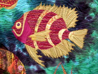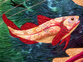 All of these quilts had just TONS of stitching on them in addition to lots of extras added on such as beads, buttons or interesting thread work. What I love about this series is the ability of these artists to just paint with fabric. The transition of colors and the highlights/contrasts really made these quilts stand out. These I suppose would be considered pictorial quilts to be placed on a wall for display. These really aren’t those softies you’d want to curl up in. Because there is so much quilting these actually are very stiff. Nonetheless, they were my favorites of the whole show.