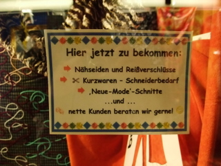 Entschuldigen Sie (excuse me), wo ist das Stoff-Lager? (where can I find the fabric store? stoffe shoppe?)