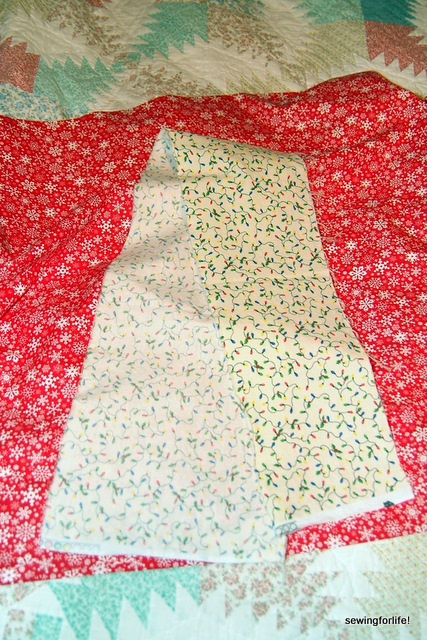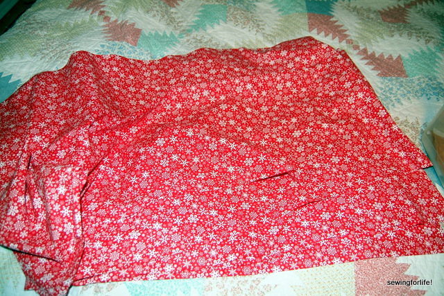 We pick out this cute red with white snowflakes. It’s marked down 50% off and I go to the cutting counter and ask for 4 yards. The lady behind the counter chit-chats with me and after I tell her what it’s for and I look over the 4 yard length, agree that that ought to be enough. Then she does the most amazing thing I’ve ever seen. She pulls on the bolt…