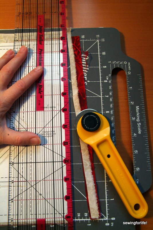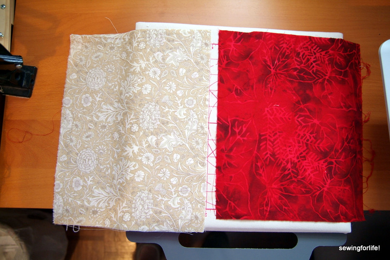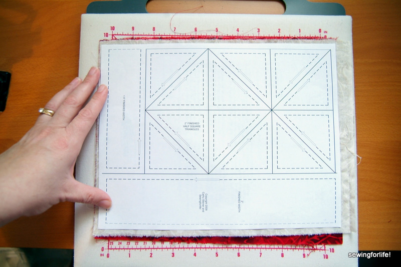 Cut out Reds and Neutrals a little larger than an 8.5″ x 11″ piece of paper. A fat quarter should yield 2. Layer a Neutral and a Red right sides together.