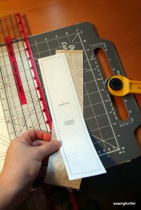Then, while you still have the template on the fabric, you can make a choice to stitch a couple of bonus lines. The long straight stitching line on the right side will yield a 2.5″ strip (2″ finished width) and the short length stitching line on the bottom will yield a 2″ strip (1.5″ finished width). Left un-stitched the 2.5″ width can be used to cut out 2.5″ neutral blocks — just an idea.