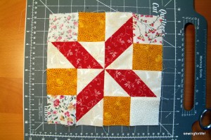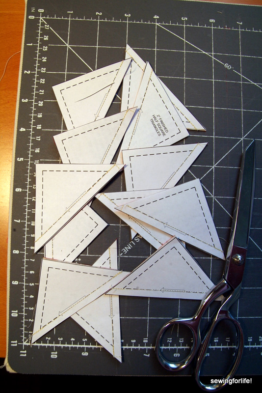 I used a rotary cutter to cut out the big pieces and then my scissors to cut the diagonal on the triangles. You can use either your scissors or the rotary cutter for all of it, it’s your choice. Both will work.