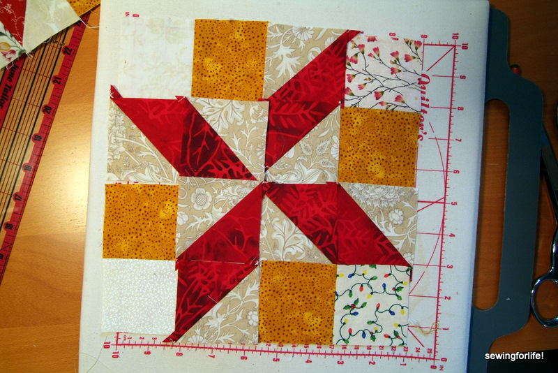 The big reason why I wanted to start with this Poinsettia Block was I can leave some of these strips aside for use in the Christmas Star Block as well as the remaining 4 red half square triangles (HST’s). Each template yields 12 HST’s and the Poinsettia block needs 8 and the Christmas Star Block needs 4…