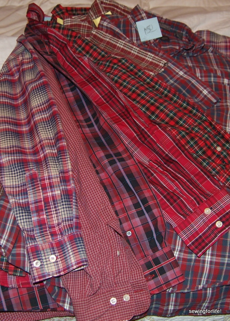 I stopped at the Salvation Army on my way home from work and browsed through the button down shirts. I looked over many a tag for the ones that said 100% cotton and decided on the above photographed red ones. 7 Shirts for a grand total of $10.42 cents.