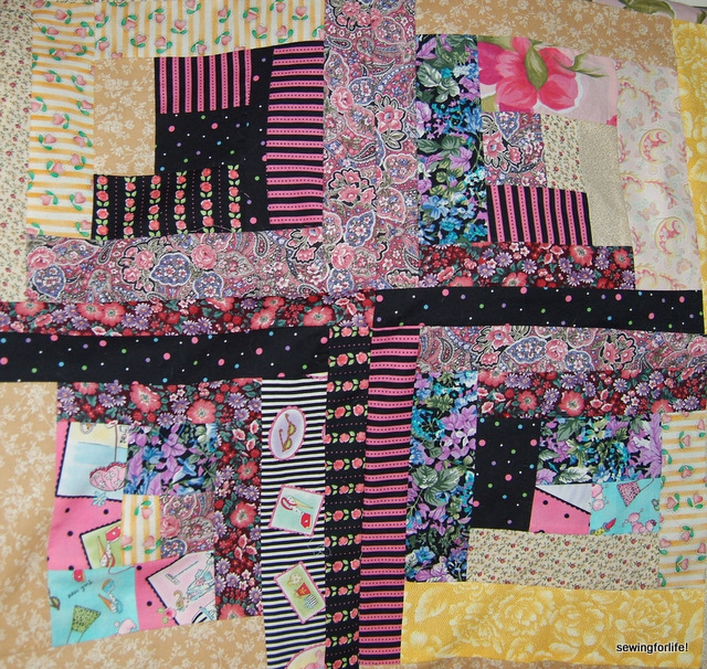 Maybe you get like this too, I don’t know, but after a bout of putting together perfectly lined up 2-1/2″ squares over and over again it begins to feel like a white knuckle ride. A little less perfection is in order. So I putzed around with a few piles of scrap.