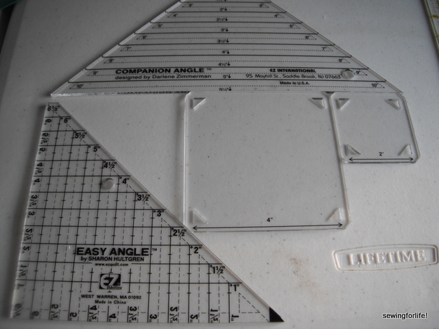 Just add a 2″ square and a 4″ square to those EZ triangle rulers I bought for the Carolina Christmas Mystery Quilt