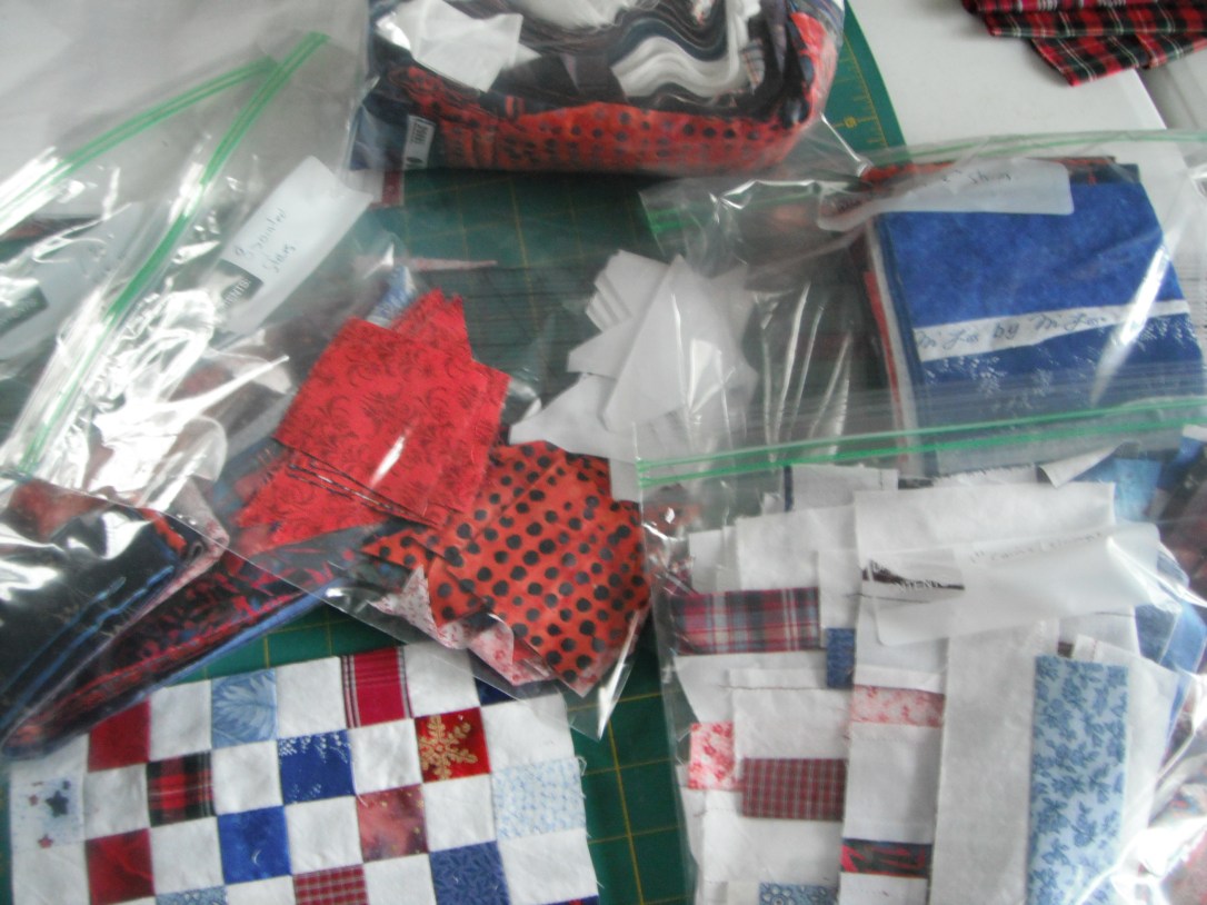 Then because I had purchased a slew of red, white and blue fabrics recently. And, oh yes…let’s not forget all those plaid shirts I picked up for a pittance, I spent a few hours cutting these up into usable blocks and strips, leftovers and strings went into a string bag.