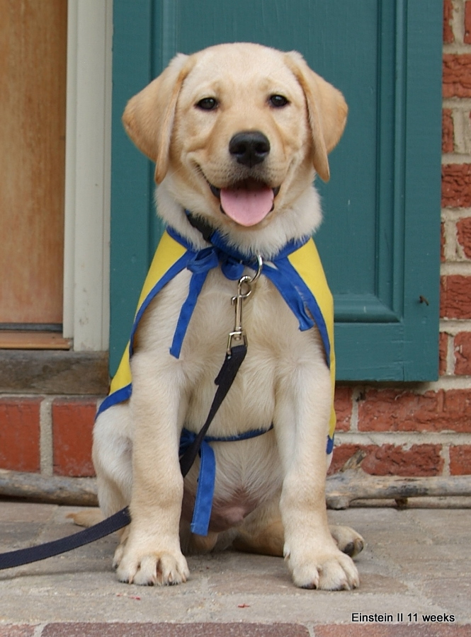 I’m hoping by then he’ll have enough of a house training pattern down that he won’t mess too much if left alone, if at all by then. One of the teens in my neighborhood will be looking in on him during the mid-day to give him a break so I think this is going to work out. It is amazing to have a new puppy. So many people are so anxious to meet the new arrival and with this little guy I don’t have that fear of meeting new dogs (as was the case with MTD). Such a relief! He is such a charmer and has been so good with everyone…but then I guess that is to be expected from a puppy. Last night was a play date with a Lab that is 5 weeks older. Wrigley is twice the size! I can’t believe that he’ll be that much bigger in just a few short weeks. Wrigley wrestled Einstein and pinned him down good but the funny thing was Einstein just took it and kept coming back for more. It was hilarious. They would just wrestle and wrestle, chase sticks, and nudge each other out of the water bowl, then go tussle some more. I guess no harm was done to the little guy, he loved it and slept like a rock all night, though the increased water going in so late in the evening made for a quick exit to the door this morning!!!! Guess I’ll need to watch that next time. We spent Saturday at the Vet. Both Chloe and Einstein were scheduled to get their shots. Einstein weighed in at 19.5 lbs and Chloe kept her 8 lb svelte figure. Can you believe how much vet prices have skyrocketed in the last few years? It was almost $350 for each pet!!! Thank goodness it is just once a year for the annual round of vaccinations, year supply of pills and flea protection. We go back for another booster in three weeks, but you know what, we knew these vaccinations would be expensive so it’s all good. Maybe I can find a place that is a little cheaper next time but right now I’m just used to the program where I’ve been going. Also on Saturday a package came for Einstein and it included his CCI training cape. Here is his first official photo in his cape. Aawwwwee! |