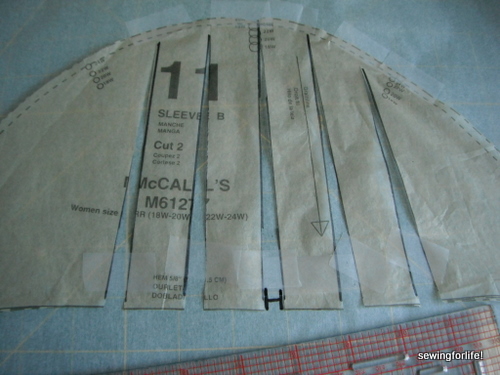 To do the slash and spread technique draw parallel lines to the grain line equidistant from each other. Cut up to, but not through, the top of the cap. Then spread these slashes apart equal amounts until you get your desired added width. Tape in place, true-up your cutting lines while cutting out your new pattern.