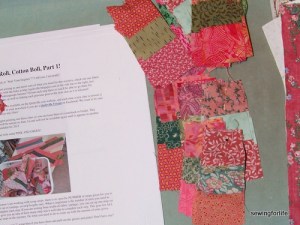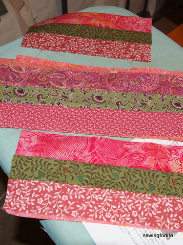 I gathered my pinks and greens, made my 2″ strips and sewed them together.