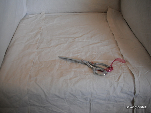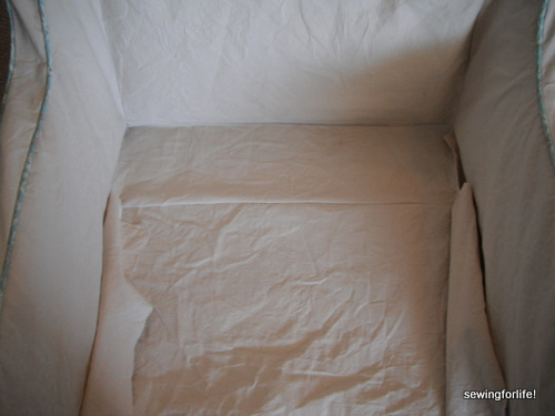 My thought here is that I can make a little tuck as it gets pulled to the back of the chair. This will leave excess fabric that gets tucked in and allows the slipcover to ‘Flex’ when a person sits in the chair.