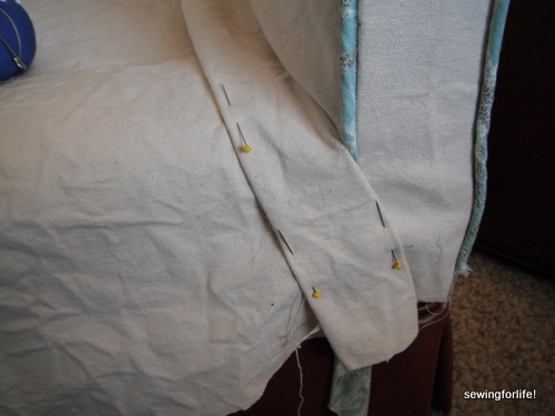 So I make it up! And bring it into the front arm area which will eventually get covered up by the skirt.