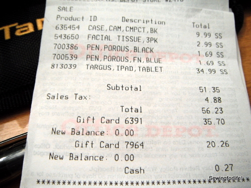Transaction: I carefully selected my items as to not go over my total rewards value. I picked up a Netbook Case, A point and shoot camera case, 3 boxes of tissues and 2 pens. I handed over my rewards card and coupon and just paid .27 cents in tax!