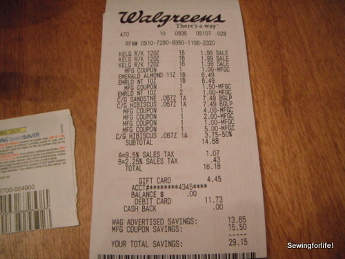 I matched up some sales with my coupons and used the remaining balance on my Walgreens Gift Card I received free. I knew I’d probably have some out of pocket as some of the stuff was a little expensive (the nuts and the lipstick/gloss). All told, Out of Pocket was $11.73 with savings of $29.15