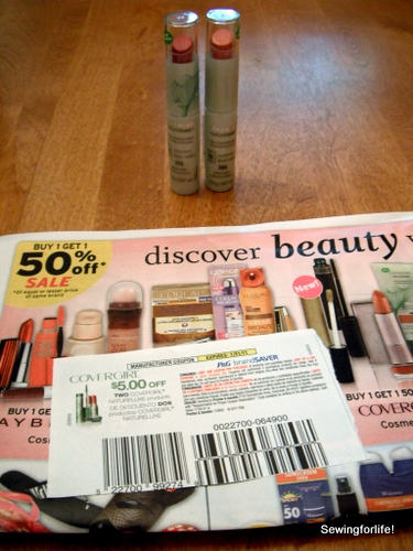 Two lipsticks at $7.49, less 1 at 50% off, less $5.00 coupon.