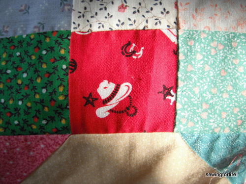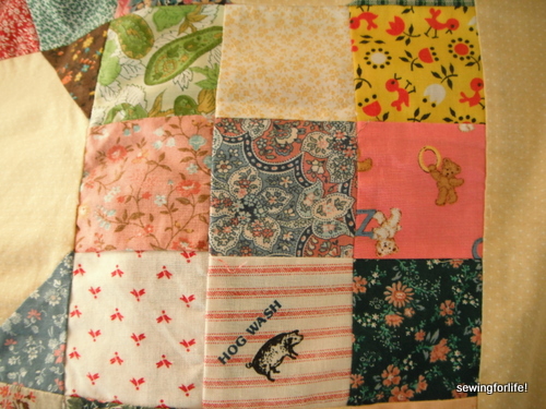 More children’s, some funky paisley and I love this little ‘Hog Wash’ square. This is what I love about scrap quilts. Up close the squares can be just awful but from far away, or when sewn together, you just get an overall effect of the colors and not the detail. Einstein approved!