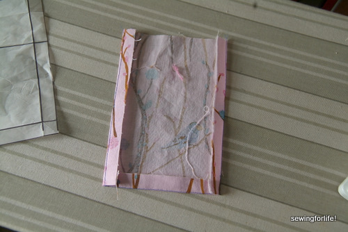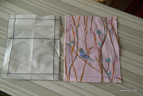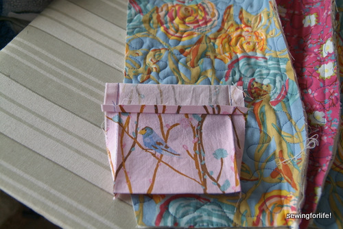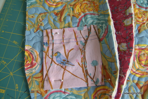Then I fussy cut out a little birdie from another Bari J. fabric from her Full Bloom line. I put the bird in the upper left third of the pocket instead of square in the middle…a little design lesson I learned in art class. Something about a pleasing composition or what not. But I think if the bird was in the middle would look just fine too!