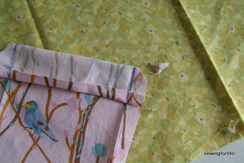 I baste stitch along the 1/2″ seam allowance. This will give me a marker for folding and pressing. This is a little trick that Mom taught me a long, long, time ago!