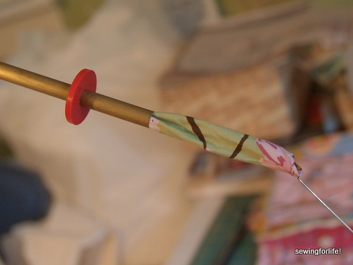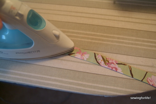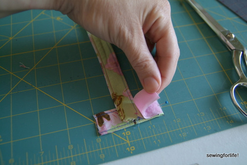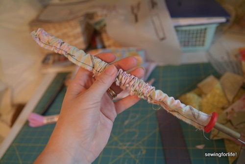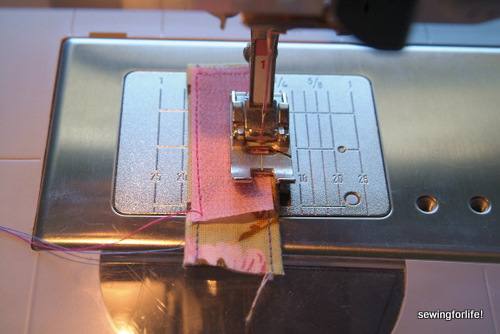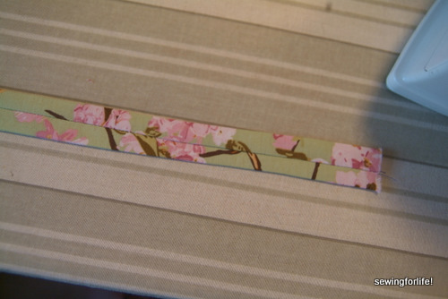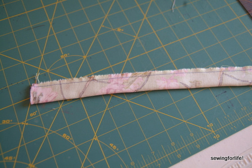 I cut and sew up two pieces of fabric 2″ wide by 22″ long (roughly, this is the length of the fat quarter). I just clip and rip… Then fold in half and sew a scant 1/4″ seam.