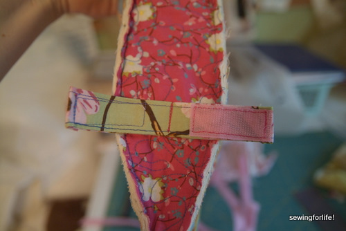 That was test one. I had only sewed it in the middle and not only was it very difficult to get in the machine (because I had already sewn up the sides) but as it would turn out, this strap was not very stable at all. Conclusion; go with plan B, which would be to sew the straps into the side seams.