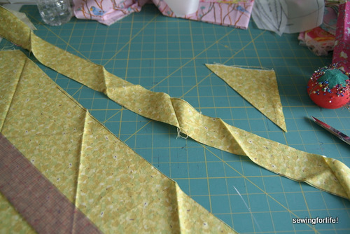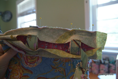 I cut a bias from more of Bari J.’s collection of fabrics, attach the ends together to make one long piece… And pin the bias to the raw edges.  I sew on the 1/4″ seam line…Turn and top stitch.  On this green edge I used a straight stitch.  In my mind I’m much better at this than in real life so for the top edge…I used another color and decided to Zig Zag the top stitching!But first sewed on a wee little button loop to help pull the top closed…There, now you can see the zig zag along the top.  Much much better!!!! A very good cover up for poor top stitching!!And here she is during her photo shoot…