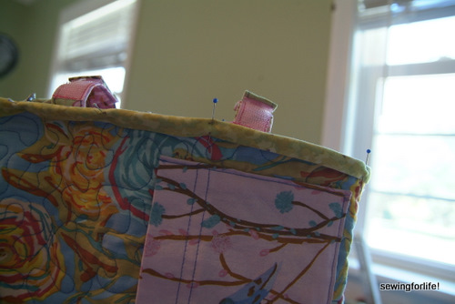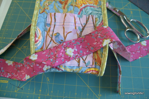 The last step in the process of making this bag was to attach the bias binding around the raw seam edges.  I added a little loop and button to the top of the bag as well.  That treatment should help keep the top of the bag from gaping open too much.