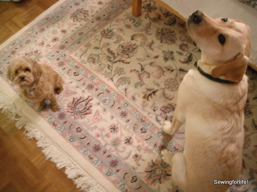 No, no, no. You cannot settle for number 5! It is No. 3 Perle Cotton that you want. — Cute photos of the dogs. The new fluffy little thing is darling.