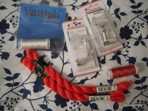 I watched the video several more times and wrote down what I was going to need. I needed to find Water Soluble Thread (who knew there was such a thing), a Pintuck Foot, and Edge Foot, some matching thread and No. 3 Perle Cotton.