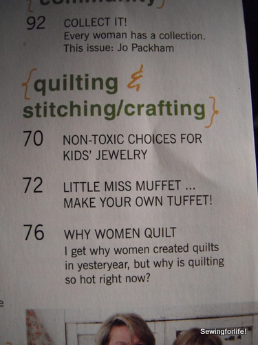 Now grant you, I didn’t notice this at first, but now that I’ve read the quilting article I’ve gone back to the table of contents and I see NOWHERE in the magazine anything about learning to make your first quilt. See…here is the table of contents: