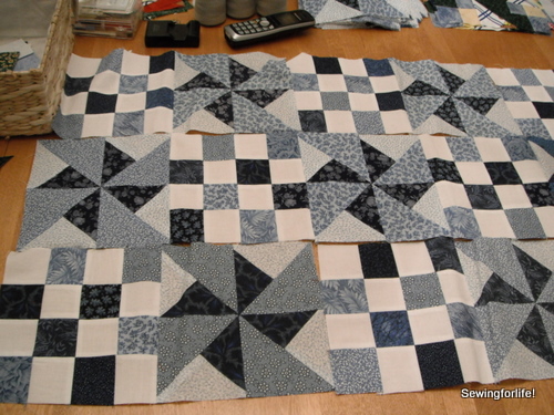 I keep plugging away and have now figured out that a good size will be using almost 100 total blocks. That’s 50 pinwheels and 50 16 patches. All counted after re-sewing the pinwheels, I have 69 pinwheel blocks! So plenty, plenty of those.