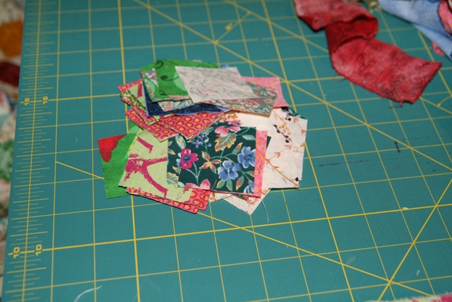 Anyhoo…I spent about a half hour this evening pulling out of my string basket some pieces that were wider than 2” wide. I wanted to cut them down into 2 inch squares.