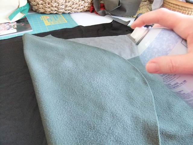 Watch out because this stuff sticks!!! This is a spray basting that washes out and cleans up with water. I am only using quick little pumps to the area and then smoothing the fabric… This worked GREAT! I forget just how fast this spray basting goes together!