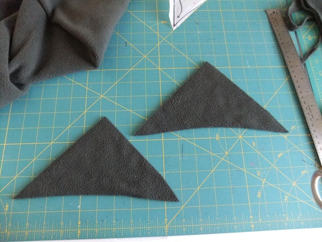 I cut out the little triangle pieces for the gusset. Just a little note here, I slightly curve the inner edge along the hypotenuse of the triangle. This will give a slight curve under the arm. Then I sew each of these to either side of the sleeve…