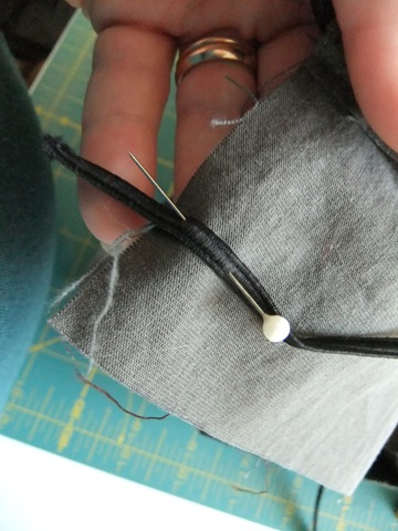 Now just thread the elastic cord through the eyelets, through the Cord Lock, through the Button/Pull hardware, back through the Cord Lock and then back through the other eyelet. Repeat through the second set and pin the ends to the front edges.
