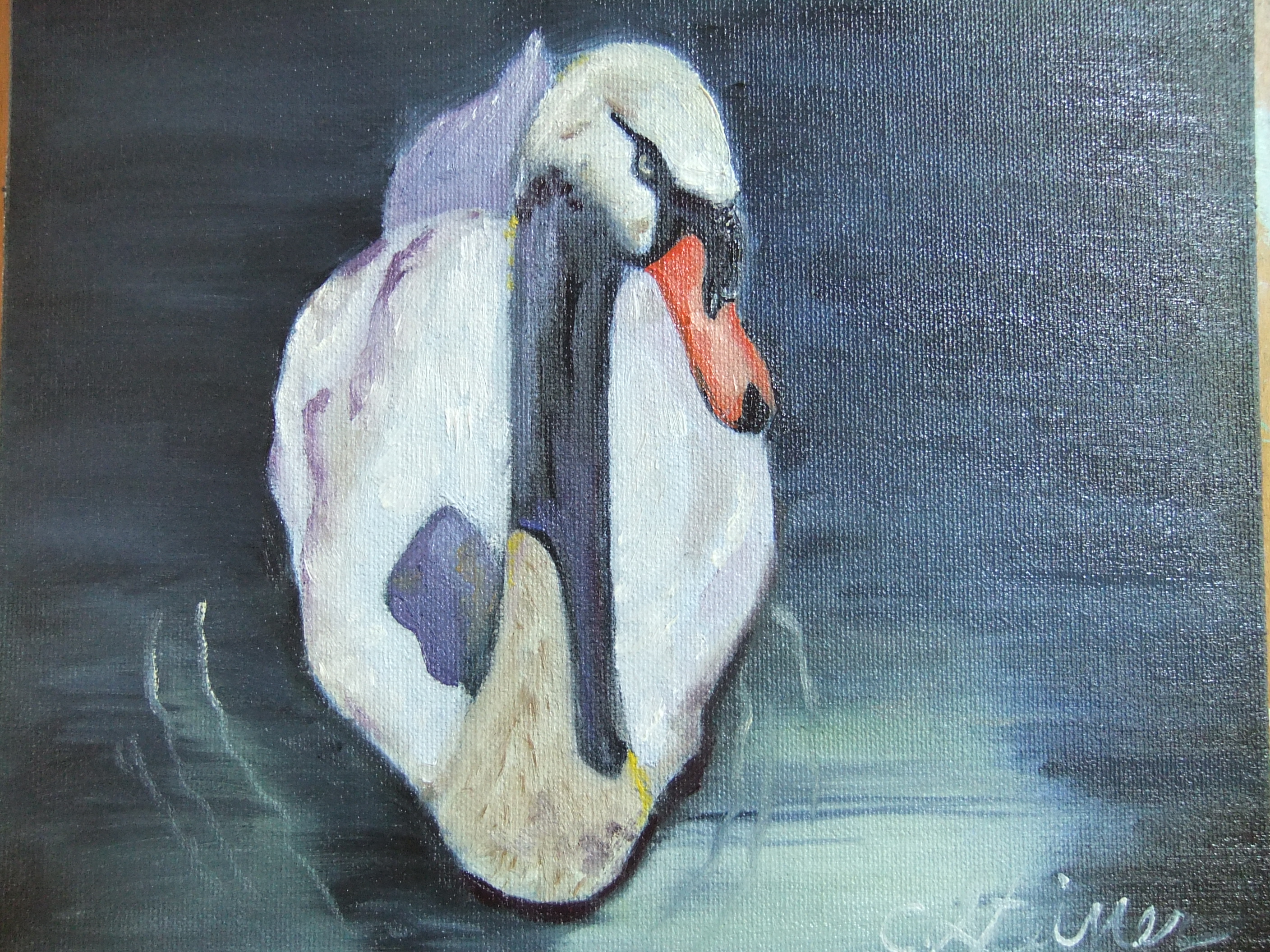 I’m sorry that I am showing you painting #2 instead of #1. My battery on my camera died (or maybe #1 was just so bad it got shut-eye) and only let me take one photo before it shut down (laugh! haar!). So here is painting #2. It is from a photograph I took of a swan that was swimming around a winery when we were in Oregon a few years back. I’m sure you’ll be able to tell it’s a swan, not so much the winery part…