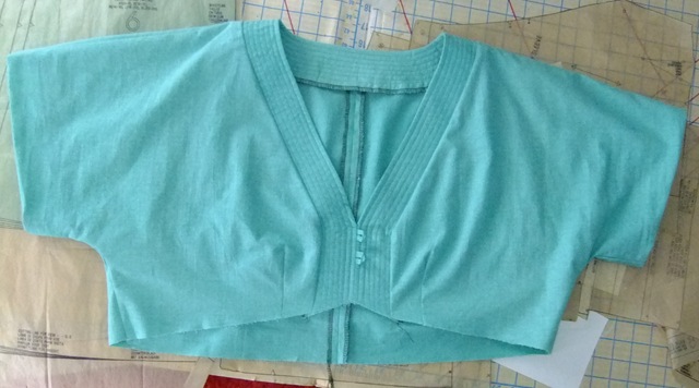 All that is left is to top-stitch the sleeves, attach the lower bodice, hem and insert some elastic that goes in the back…and sew on some buttons to the front. Here’s a close-up of the decorative top-stitching.