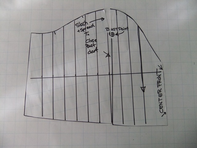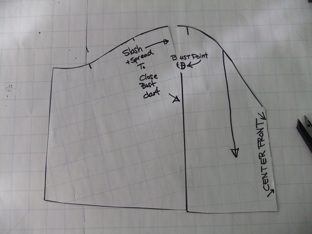 5. The Neck Band and the Upper Bodice pieces are finished. What’s left is to work out the Bottom Bodice piece. The first thing I need to do is transfer the waist dart into the that curved edge above the bust point. I slash into the bust point and close the dart…