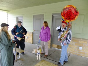 Here is Jamba (above) on our trip to Madison, WI a few weeks ago.  He looks so cute in his Big Boy vest!  During that trip we also ran into a few members from a HONK band……and they sang Happy Birthday to me…er…to us.