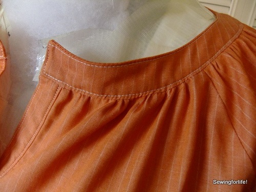 I’ll close with this close up of the neck band.  This, to me, was a little challenging.  I mostly had difficulty keeping it even all the way around.  For some reason the band tended to get narrower as it came over the shoulders.  I know it’s just a lack of fine sewing on my part and I’ll need to pay more attention to that!  I think because it worked out the same on both sided it actually looks intentional!11-DSCF3468