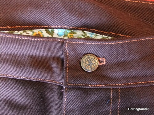 12-DSCF3475 For the button, I found some hardware at Vogue Fabrics of all places.  I actually went there after work to see what Denim offerings they had and would you believe they actually had several styles of jean buttons, dungaree buttons, lots of denim choices, though you have to move very heavy rolls to get your hands on what you want, but the one thing that was missing were rivets!!!  They had the rivet tool but absolutely no rivets!  So those will be elusive for me and I’ll need to find a source on-line.  I still have some silver rivets leftover from the last pair but I really want a copper color for this version.
