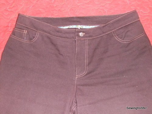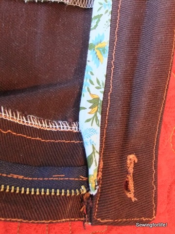 I experimented with some added topstitching along the center front and adding a bias finished edge to the waistband.  I had mixed results but it was a good lesson to go through those processes.15-DSCF3480 The thread I used this time was the Dual Duty Jeans Topstitching thread and I have to say I DID NOT LIKE IT!!!  It was so hard for my machine to get a good tension with it and I did get frustrated having to take out back stitching, several times!  And look at that buttonhole.  Oh.  I had some difficulty.  I think I’ll have to fix it with just a handworked button hole and call it a day.