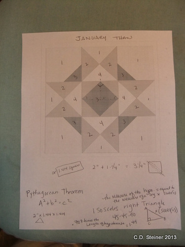 For the next block in this series I’ve chosen to do a block that will mark off the passing of time.  “January Thaw!” is a traditional block pattern that has just the appropriate name considering it is supposed to be 60 degrees today!!!