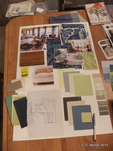 I have samples of fabrics, floors, kitchen cabinets, tile, design books, vacuum cleaners, carpet cleaners, may camera bag and furniture just mishmashed together trying to figure out a floorplan. What is going to stay and what is going to go! Oh the decisions!!!
