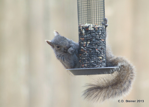 Go find your own nuts! I watched this squirrel come down the tree, then down the hanging rod and launch himself mid-air over the squirrel guard (note to manufacturer — they’ve figured it out!) with all four legs stretched out. His back right leg caught the lip of the dish and that was that, he’s in like Flynn!!!