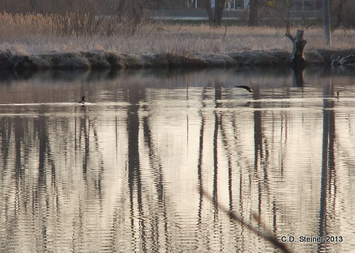 One bird that has hung around is the Cormorant (four are in flight in the photo above). I actually thought these were loons until I looked them up. They are hard to get a picture of because as soon as you see them they dive under the water. Someday I’ll probably just sit out near the lake and try and get a good picture but for now, the morning dog walks will have to do for my snap shot time.