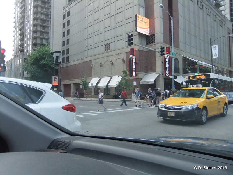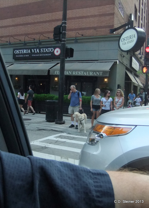 Then as we turned left I looked back and saw a typical Chicago scene. The light had now turned in the pedestrian’s favor to go forward into the intersection but now the intersection is full of cars and impossible to cross. What looks like a bus stopping to pick up this man is just a bus stuck in the crosswalk. The dog, ever to figure out a way to get around this bus was pulling the man back and away from the bus…