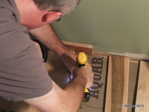 Jim and I talked about getting this little technique on camera, in case you do your own wood floor installation some day and need to borrow this idea! This came about after several unsuccessful attempts at trying to ‘close the gaps’ in between the boards. My husband really is quite clever!