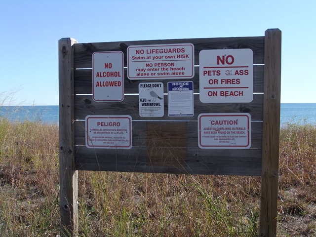 More signs reminding us not to bring pets, glass, fires or alcohol onto the beach. Plenty of warnings not to feed the birds and animals and if you swim you could drown…etc… ![]()