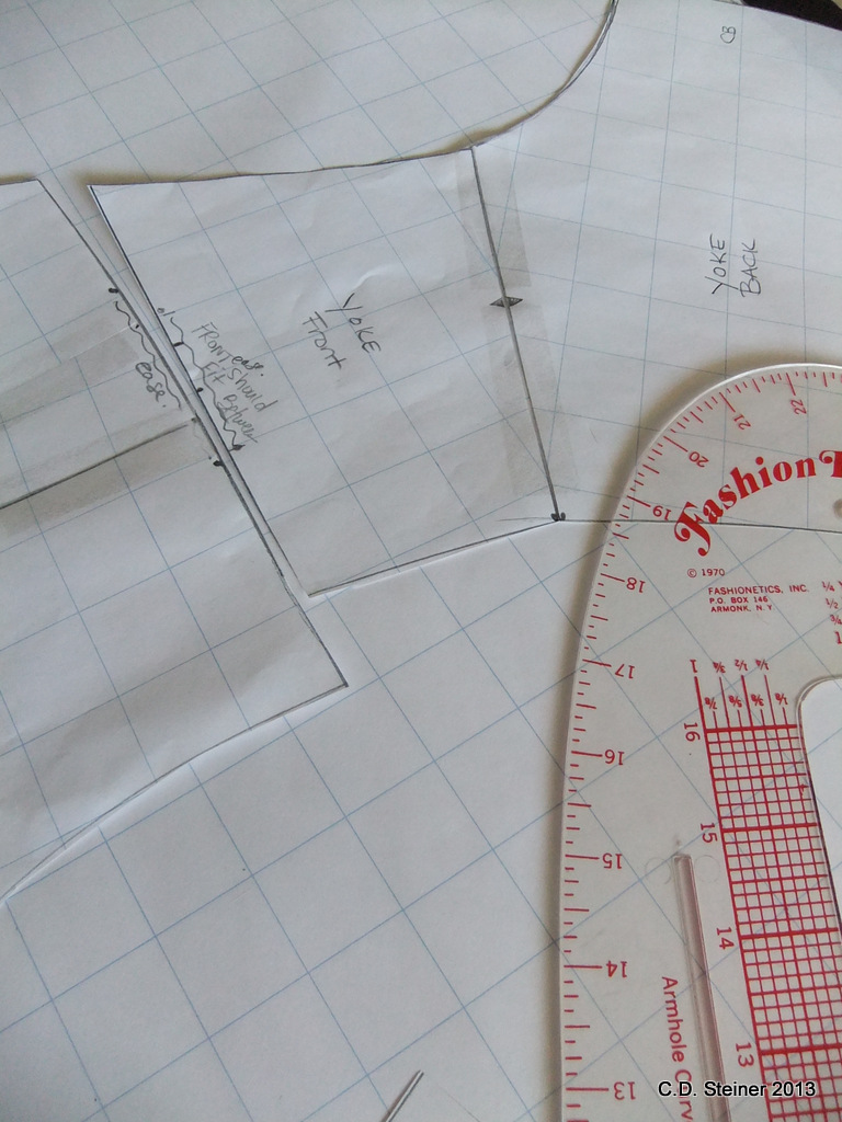 I pulled out the pattern paper, my basic fitting shell templates, and delved into the process of drafting up the solution to my sketch.
