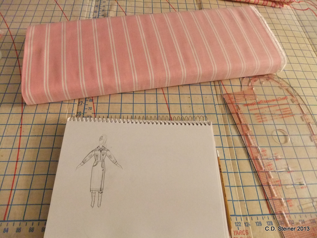Sort of a westernesque theme. I see the shirt in check and the skirt as a wrap with a zipper closure, pretty simple really. I had let the sketch sit for a few days and thought more about how to execute the idea, especially the shirt. I wasn’t too sure what I was thinking about those darts under the bust but I must have thought I wanted something a bit more form fitting.